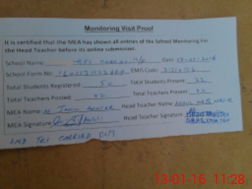| Attendance Register | Head Teacher | MEA with School | Visit Proof |