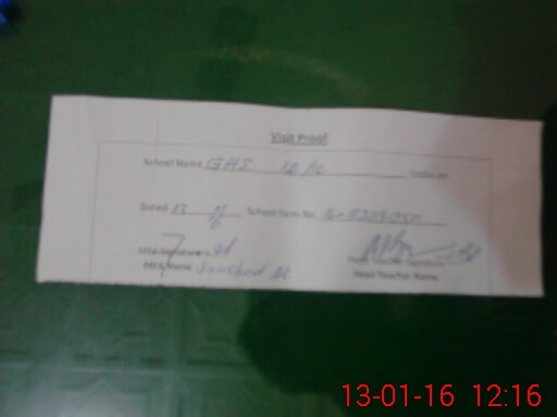 | School Visited by School Health & Nutrition Supervisor (No. of Visits) | 1 | Name1: | KHALID JAVED | Name2: | |