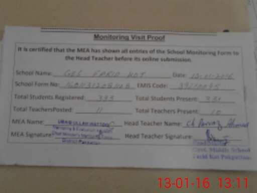 | EMIS Code: 39210045 | Name of School: GHS FARID KOT P/O PAKPATTAN | |||
