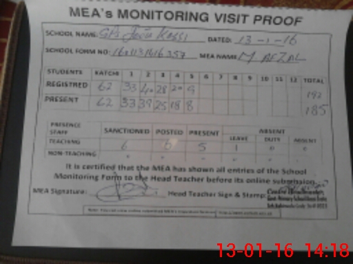| Attendance Register | Head Teacher | MEA with School | Visit Proof |