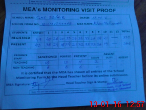 | Attendance Register | Head Teacher | MEA with School | Visit Proof |