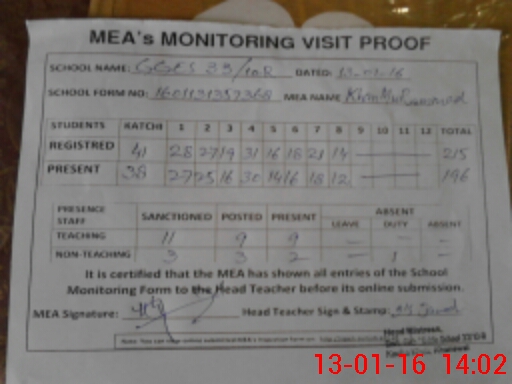 | Attendance Register | Head Teacher | MEA with School | Visit Proof |