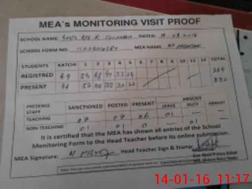 | Attendance Register | Head Teacher | MEA with School | Visit Proof |