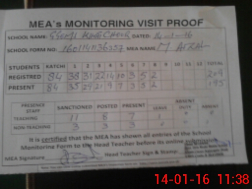 | Attendance Register | Head Teacher | MEA with School | Visit Proof |