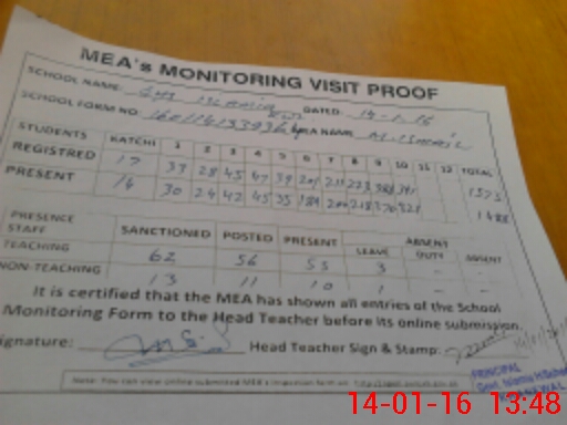 | Attendance Register | Head Teacher | MEA with School | Visit Proof |