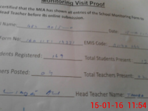 | Attendance Register | Head Teacher | MEA with School | Visit Proof |