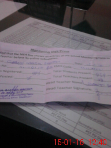 | School Visited by School Health & Nutrition Supervisor (No. of Visits) | 1 | Name1: | Fouzia | Name2: | Nil |