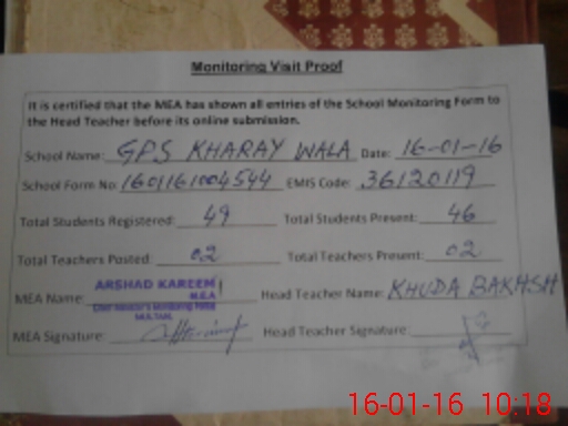 | EMIS Code: 36120119 | Name of School: GPS KHARAY WALA P.O MATOTLI | |||