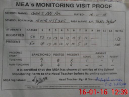 | Attendance Register | Head Teacher | MEA with School | Visit Proof |