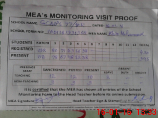 | Attendance Register | Head Teacher | MEA with School | Visit Proof |