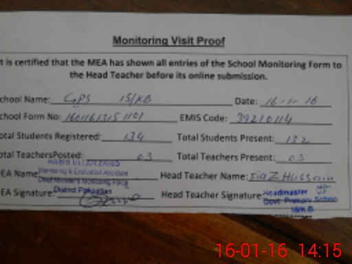| EMIS Code: 39210114 | Name of School: GPS CHAK NO 15 KB | |||