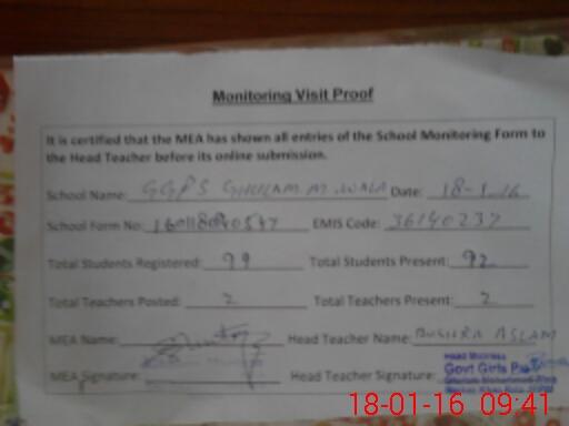 | Attendance Register | Head Teacher | MEA with School | Visit Proof |