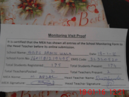 | EMIS Code: 32320520 | Name of School: GGPS ARAIN WALA NO.2 | |||