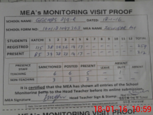 | Attendance Register | Head Teacher | MEA with School | Visit Proof |