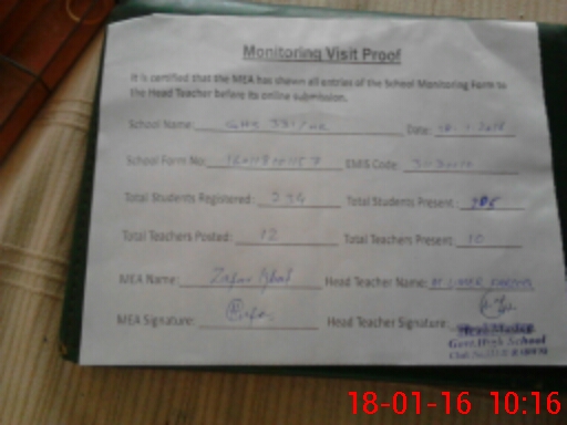 | School Visited by School Health & Nutrition Supervisor (No. of Visits) | 1 | Name1: | MAQSOOD | Name2: | NIL |