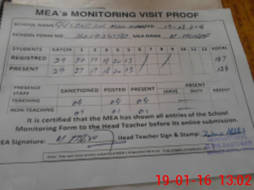 | Attendance Register | Head Teacher | MEA with School | Visit Proof |