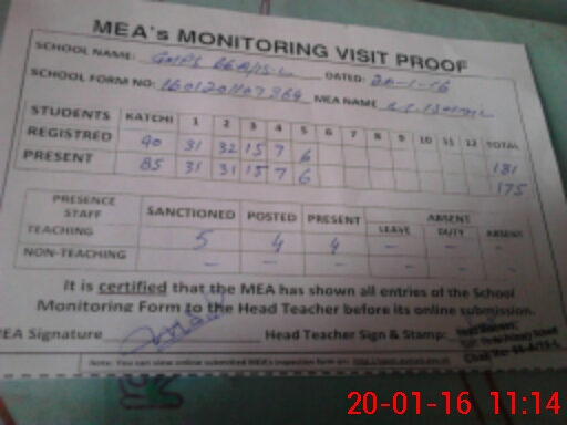 | Attendance Register | Head Teacher | MEA with School | Visit Proof |