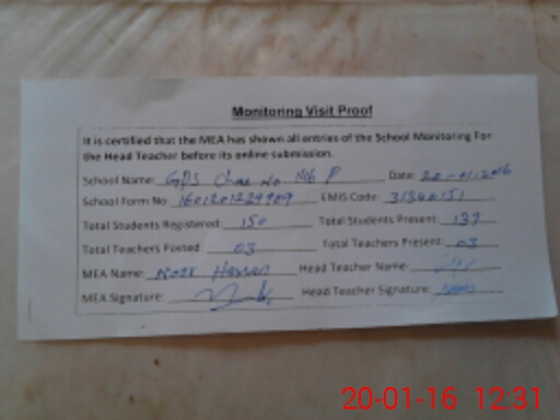 | Attendance Register | Head Teacher | MEA with School | Visit Proof |