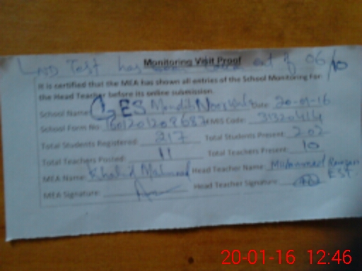 | Attendance Register | Head Teacher | MEA with School | Visit Proof |