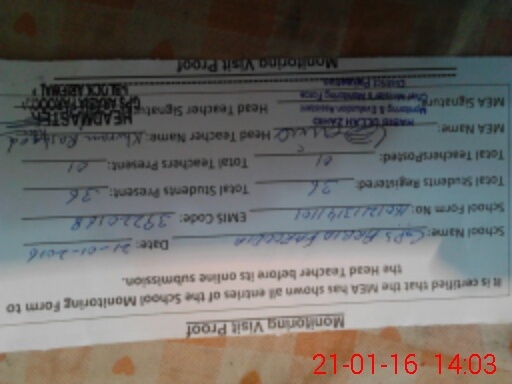 | Attendance Register | Head Teacher | MEA with School | Visit Proof |