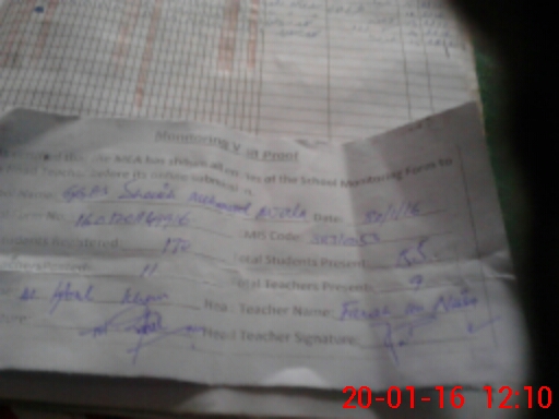 | School Visited by School Health & Nutrition Supervisor (No. of Visits) | 1 | Name1: | Mushtaq Ahmed | Name2: | |