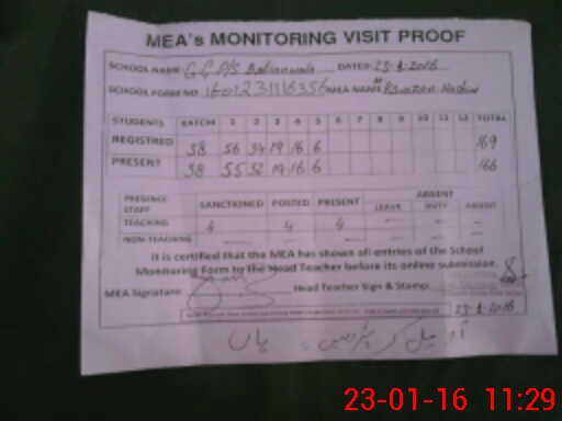 | Attendance Register | Head Teacher | MEA with School | Visit Proof |