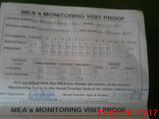 | Attendance Register | Head Teacher | MEA with School | Visit Proof |