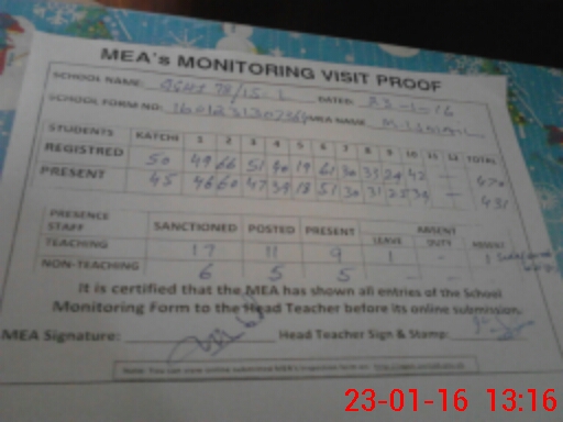 | Attendance Register | Head Teacher | MEA with School | Visit Proof |