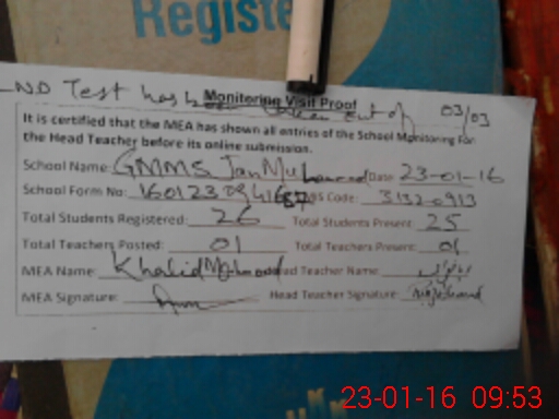 | Attendance Register | Head Teacher | MEA with School | Visit Proof |