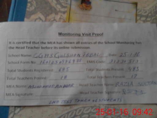 | EMIS Code: 31330513 | Name of School: GGHS GULSHAN IQBAL | |||