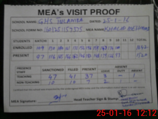 | Attendance Register | Head Teacher | MEA with School | Visit Proof |