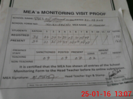 | Attendance Register | Head Teacher | MEA with School | Visit Proof |