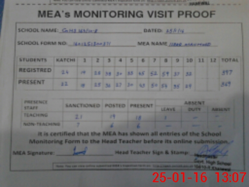 | Attendance Register | Head Teacher | MEA with School | Visit Proof |