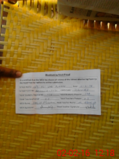 | Total no. of Classrooms: 2 No. of Classrooms Used for Teaching: 2 No. of Classrooms Storing Old Furniture, FTBs, etc: 0Comments if Any: School working in a rented building and land available boundarywall and maingate existing and building needed |