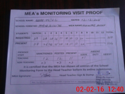 | Attendance Register | Head Teacher | MEA with School | Visit Proof |