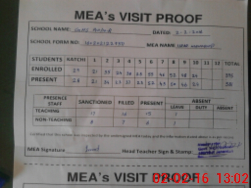 | Certified that this School was Inspected by the Undersigned MEA/DMO Today and the Information Stated Above is as Per Record. | |||||
