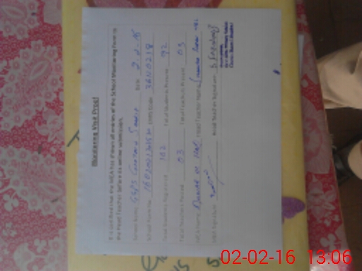 | Total no. of Classrooms: 2 No. of Classrooms Used for Teaching: 2 No. of Classrooms Storing Old Furniture, FTBs, etc: 0Comments if Any: One class room roof dangerous |