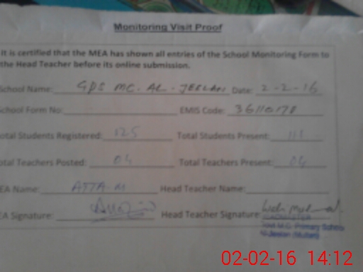 | EMIS Code: 36110170 | Name of School: GES MC AL-JEELLAN WALA MULTAN | |||