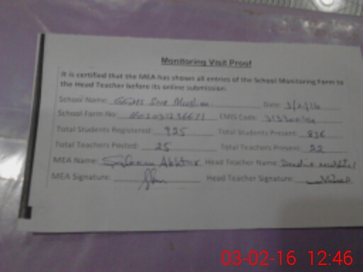 | Attendance Register | Head Teacher | MEA with School | Visit Proof |