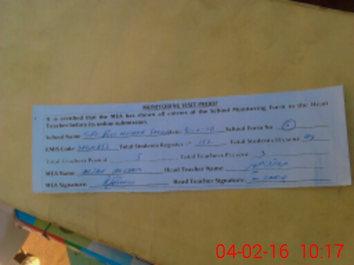 | Attendance Register | Head Teacher | MEA with School | Visit Proof |