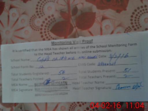 | Attendance Register | Head Teacher | MEA with School | Visit Proof |