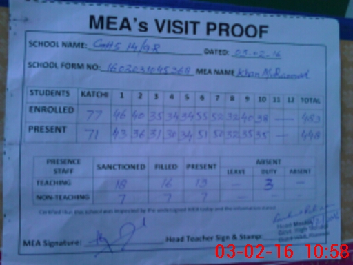 | Attendance Register | Head Teacher | MEA with School | Visit Proof |