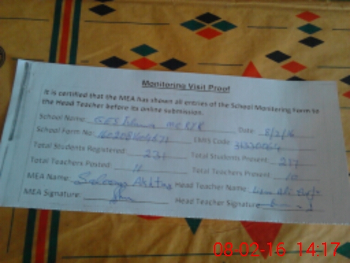 | Attendance Register | Head Teacher | MEA with School | Visit Proof |