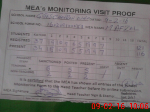 | Attendance Register | Head Teacher | MEA with School | Visit Proof |