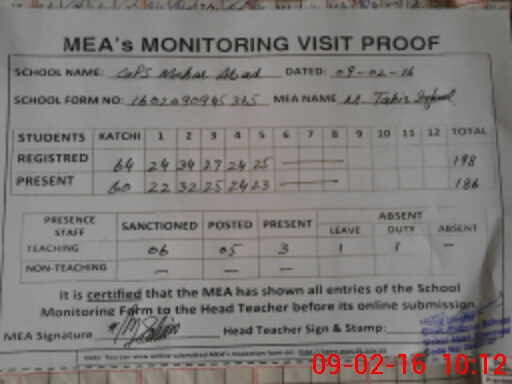 | Attendance Register | Head Teacher | MEA with School | Visit Proof |