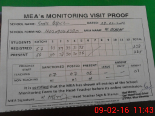 | Attendance Register | Head Teacher | MEA with School | Visit Proof |
