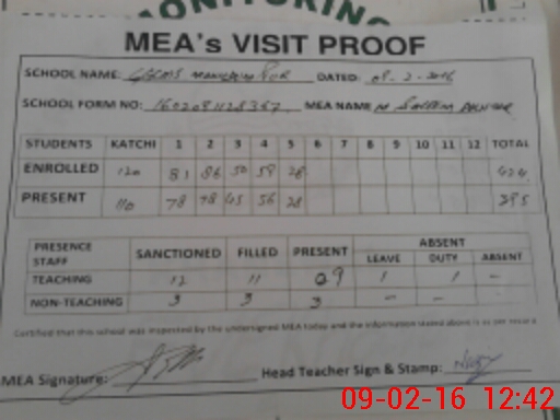 | Attendance Register | Head Teacher | MEA with School | Visit Proof |