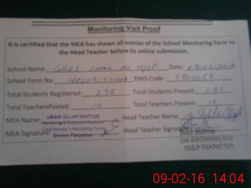 | District: PAKPATTAN | Tehsil: PAKPATTAN | Markaz: PAKPATTAN 5 - FEMALE | Level: Middle | |