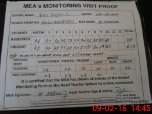| Attendance Register | Head Teacher | MEA with School | Visit Proof |