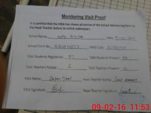 | Attendance Register | Head Teacher | MEA with School | Visit Proof |